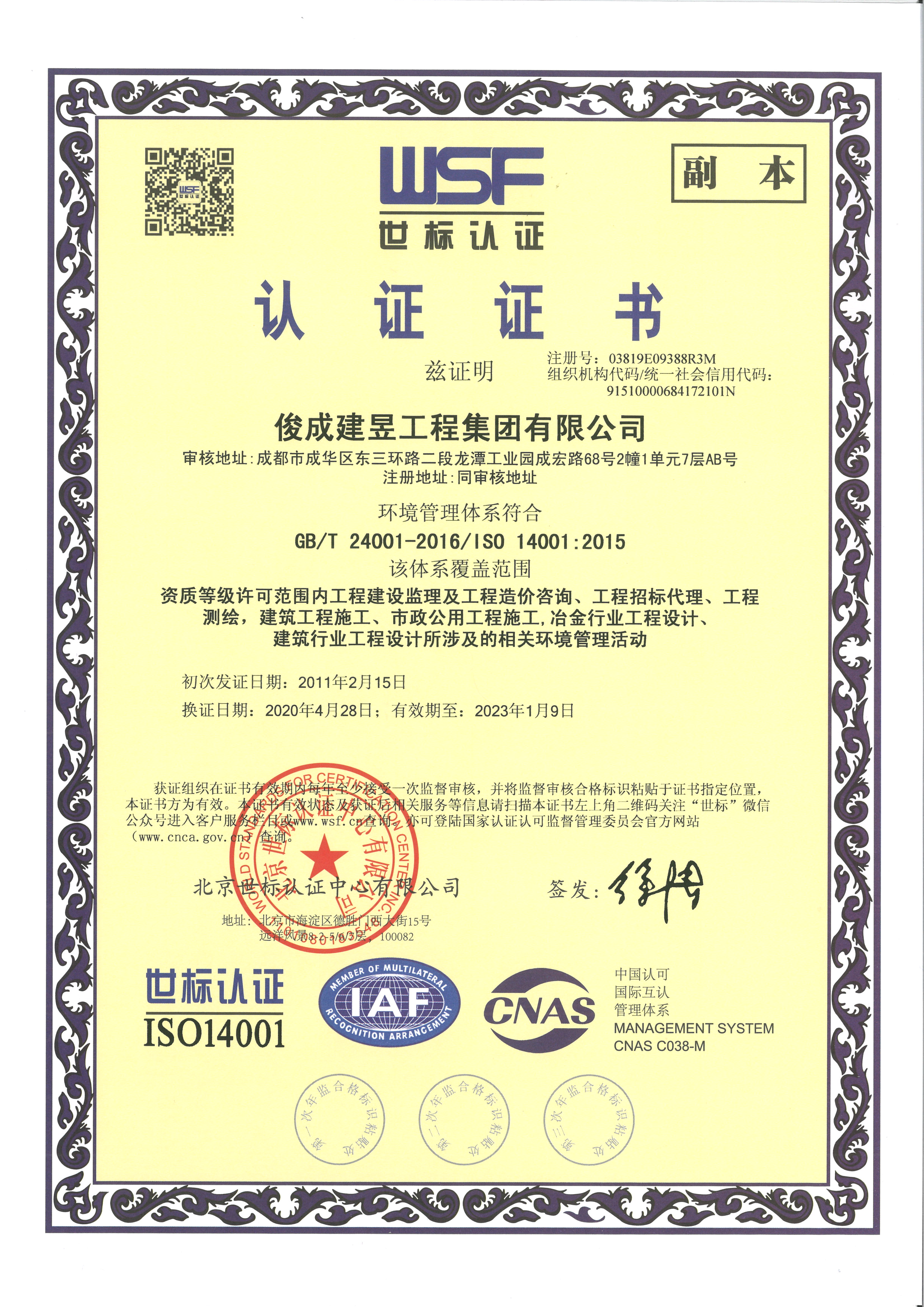 12月1日至2日,北京世標認證中心審核專家組一行四人蒞臨俊成建昱工程集團有限公司,對俊成建昱工程集團有限公司進行了ISO質量、環境、職業健康安全三體系年度監督審核。俊成建昱工程集團總經理黎智、常務副總李浩成及俊成建昱工程集團相關部門主管予以全力支持與配合。